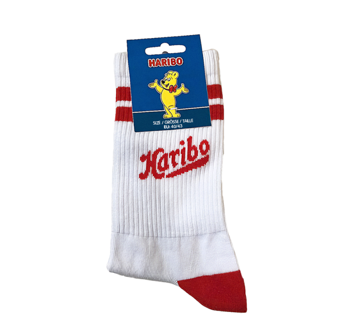 As meias vintage HARIBO são uma forma original e divertida de trazer o espírito mais doce da marca para o seu dia a dia. Com um design marcante em branco e vermelho e o inconfundível logótipo HARIBO, tornam-se um acessório ideal tanto para oferecer como para usar por si. Um item colecionável que os fãs da HARIBO vão adorar e que dará um toque divertido a qualquer look.